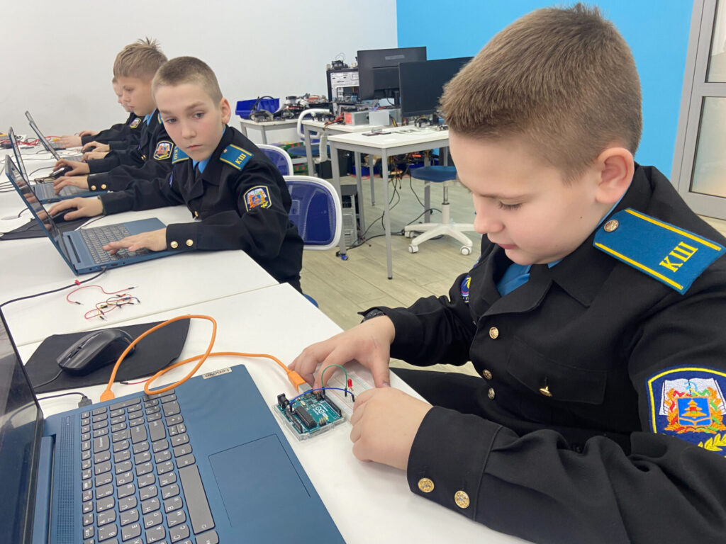 У Круговых Александр Андреевича самая увлекательная часть! Ребята познакомились с контроллерами Arduino и написали свои первые программы, заставив «железо» выполнять команды.