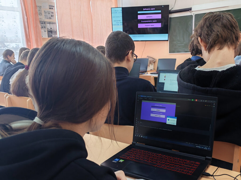 На программировании было жарко! Ребята написали собственное приложение — «Генератор идей». Это не просто программа, а настоящий помощник в борьбе со скукой. Достаточно нажать кнопку — и ты получаешь занятие по душе. А еще в приложении есть функция добавления своих идей! Развиваем не только хард-скиллы, но и креативность.